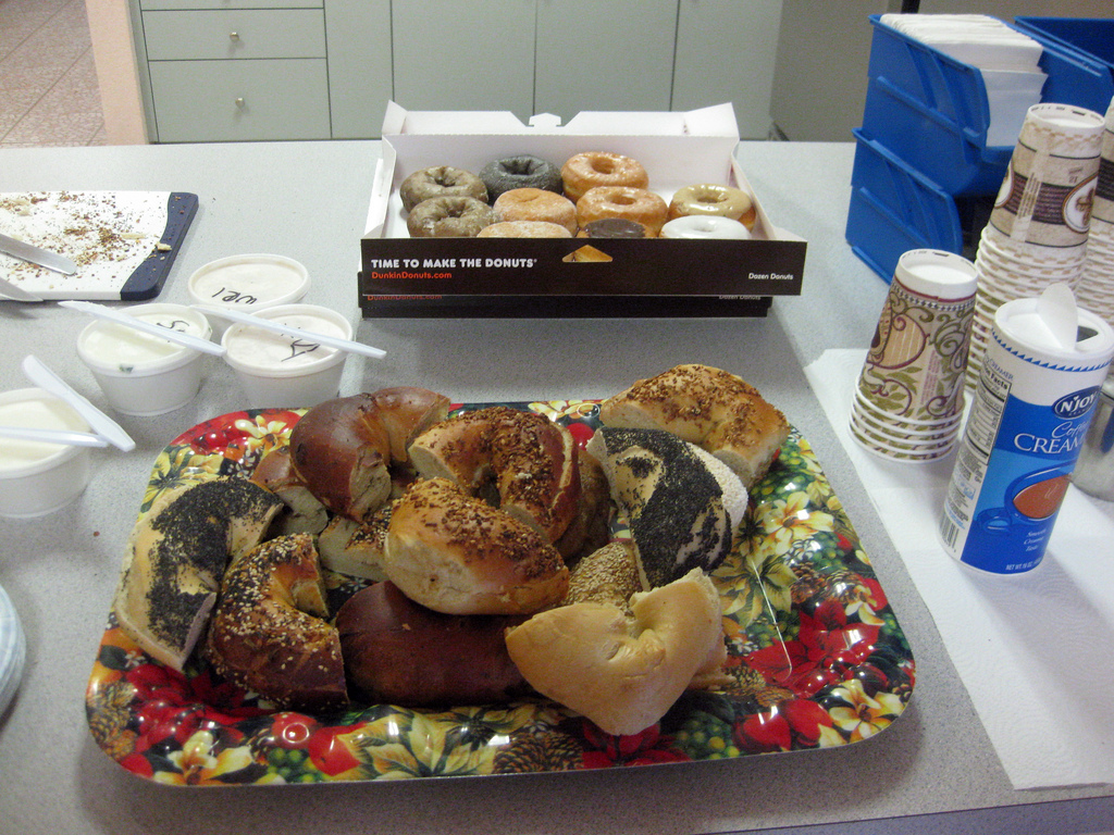 Unfortunately, it is an assortment of jelly filled pastries, large bagels he got from H&H bagels in NYC and a variety of donuts. What is the best choice? The better bad choice rule may apply, as all the choices are complex carbohydrates. In that situation, the donut, depending on the type of donut may be the best option.